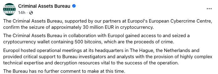 O Gabinete de Ativos Criminais da Irlanda (CAB) anunciou que conseguiu acessar uma carteira de criptomoeda com 500 Bitcoin (BTC), que vale mais de US$ 35 milhões. Isso foi possível graças à ajuda do Centro Europeu de Crimes Cibernéticos da Europol.