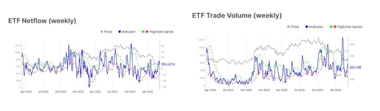 A dinâmica do preço do BTC está melhorando, com aumento no volume de transações e entradas significativas em ETFs.
