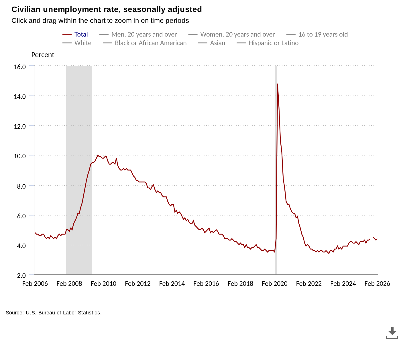 A economia perdeu 92 mil empregos em fevereiro, ao contrário do aumento esperado de 58.000. A taxa de desemprego também subiu para 4,4%.