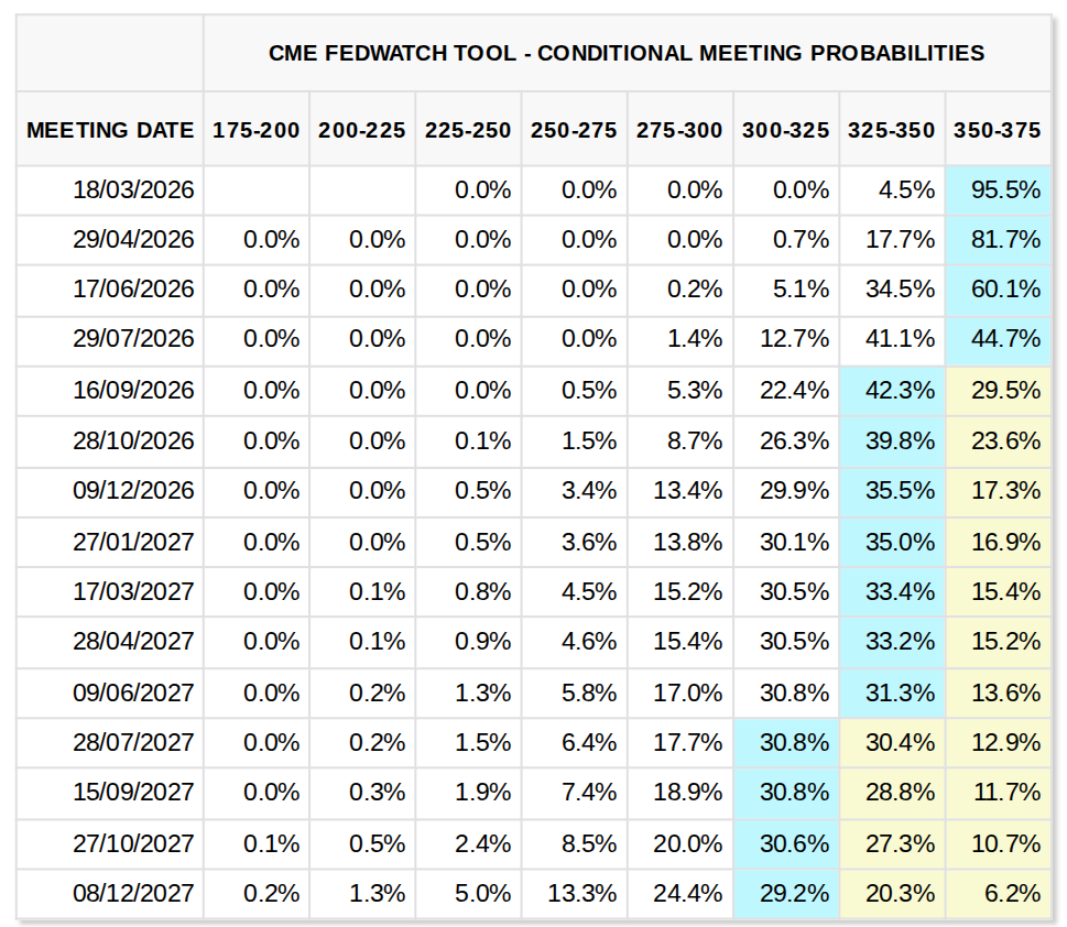 Contudo, poucos esperam que a Reserva Federal faça isso na próxima reunião em 18 de março. O mercado também prevê apenas um corte de taxa em 2026.