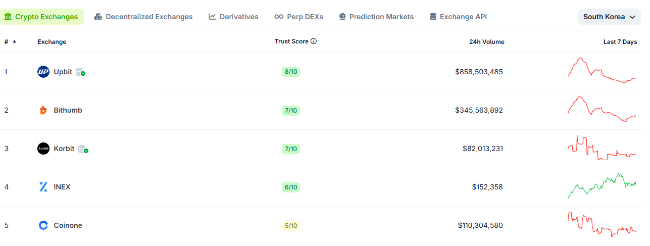 Atualmente, a Upbit é a líder em volume de negociação, seguida pela Bithumb e Korbit, conforme os dados da CoinGecko.