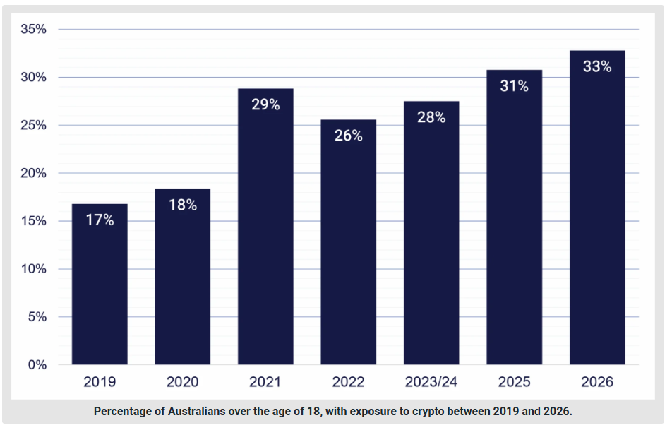 De acordo com o Índice de Criptomoedas da exchange Independent Reserve, cerca de 33% dos australianos já têm contato com criptomoedas, aumento em relação aos 31% de 2025, numa população de mais de 27 milhões. Mais pessoas estão utilizando criptomoedas para comprar bens e serviços.