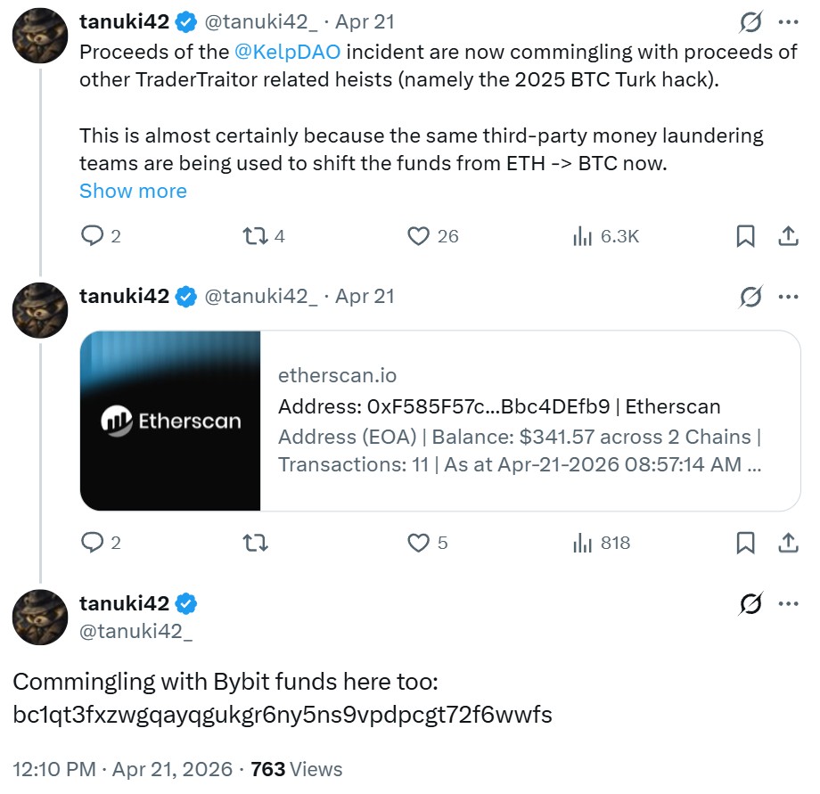Investigadores de blockchain também encontraram ligações com o TraderTraitor. Estudos mostraram que os fundos roubados em Kelp DAO foram misturados com recursos de ataques anteriores desse mesmo grupo.