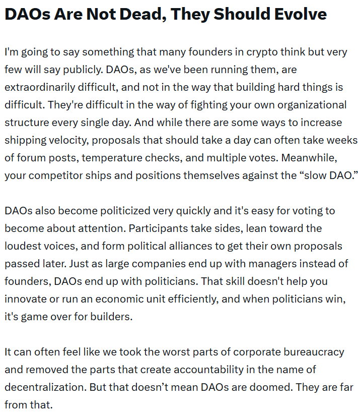 Kulechov alertou que as DAOs podem acabar removendo o que é necessário para a responsabilidade, em nome da descentralização. Contudo, ele acredita que isso não significa que as DAOs estejam condenadas; elas ainda têm um grande potencial.
