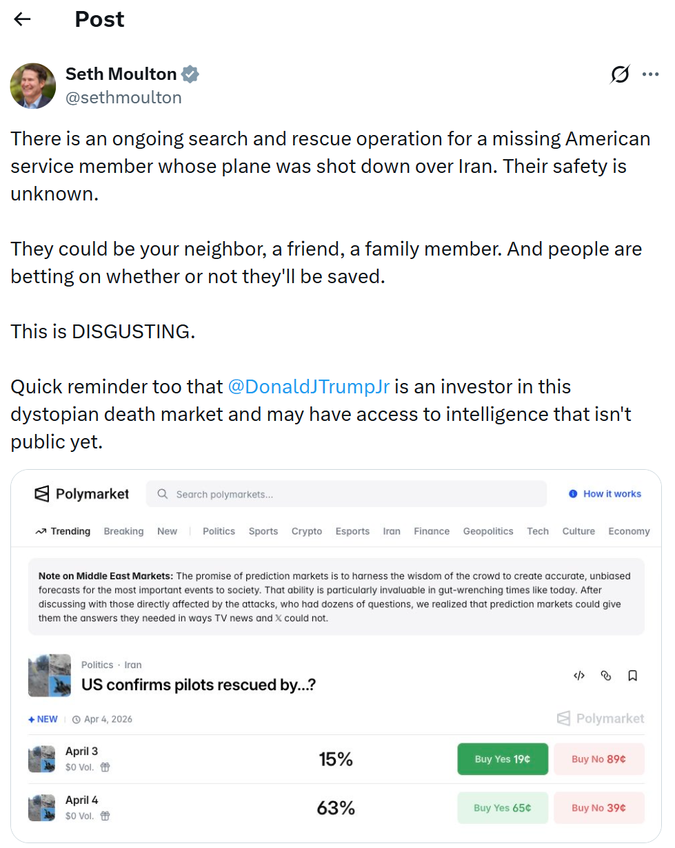 Esse burburinho começou quando surgiu um mercado de previsões que questionava se as autoridades dos EUA confirmariam o resgate de um piloto que teria sido abatido no Irã. A maioria dos usuários (mais de 60%) apostava que ele não seria resgatado até sábado.