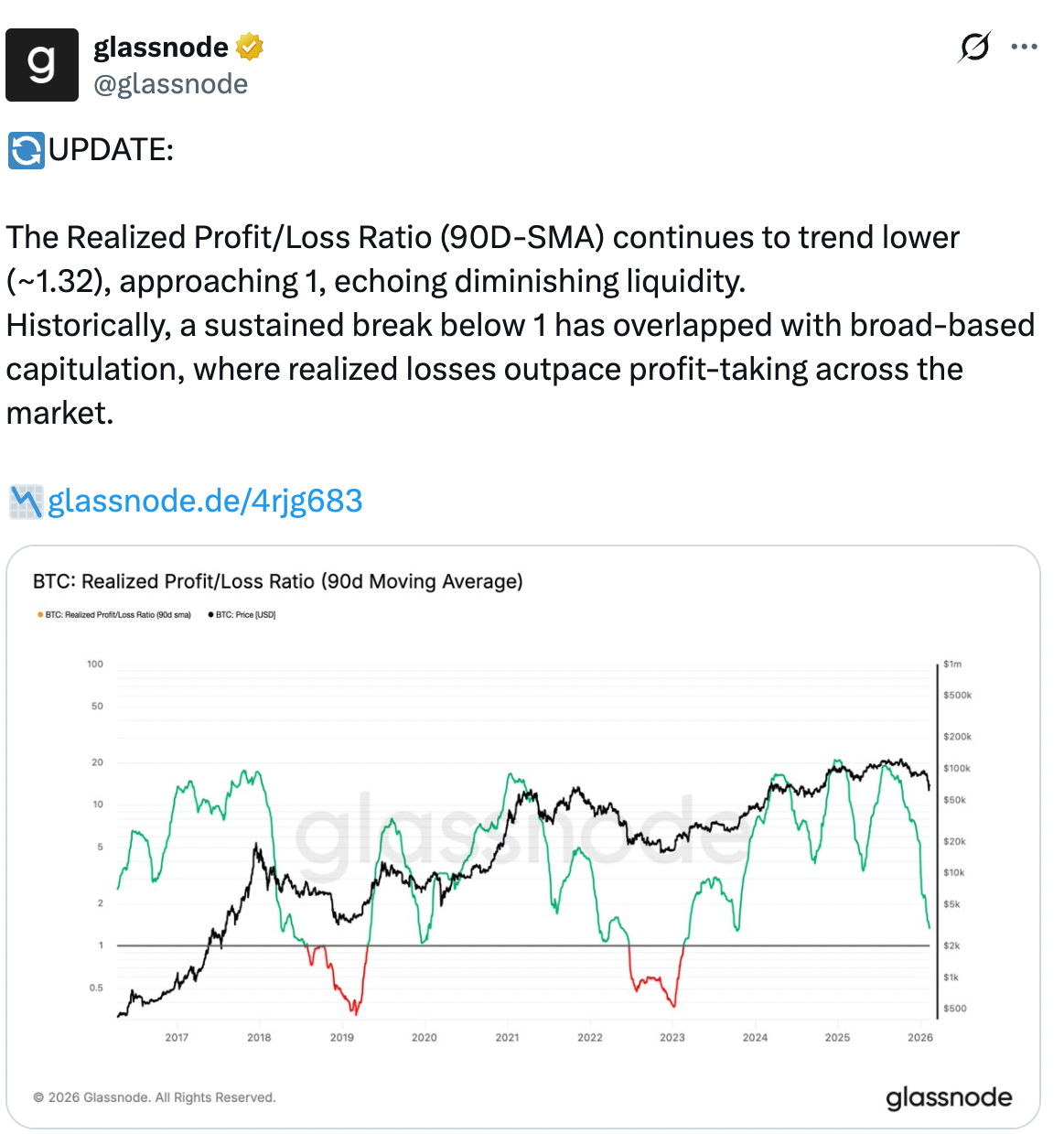 A relação entre lucro e perda do Bitcoin está prestes a cair para níveis que costumavam significar que muitos investidores estavam perdendo dinheiro.