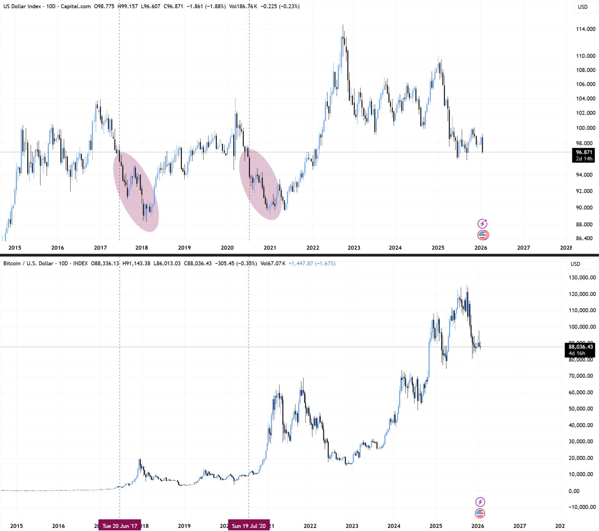Outro trader, BitBull, viu que a fraqueza do dólar poderia indicar que o BTC pode ter uma baixa a longo prazo.